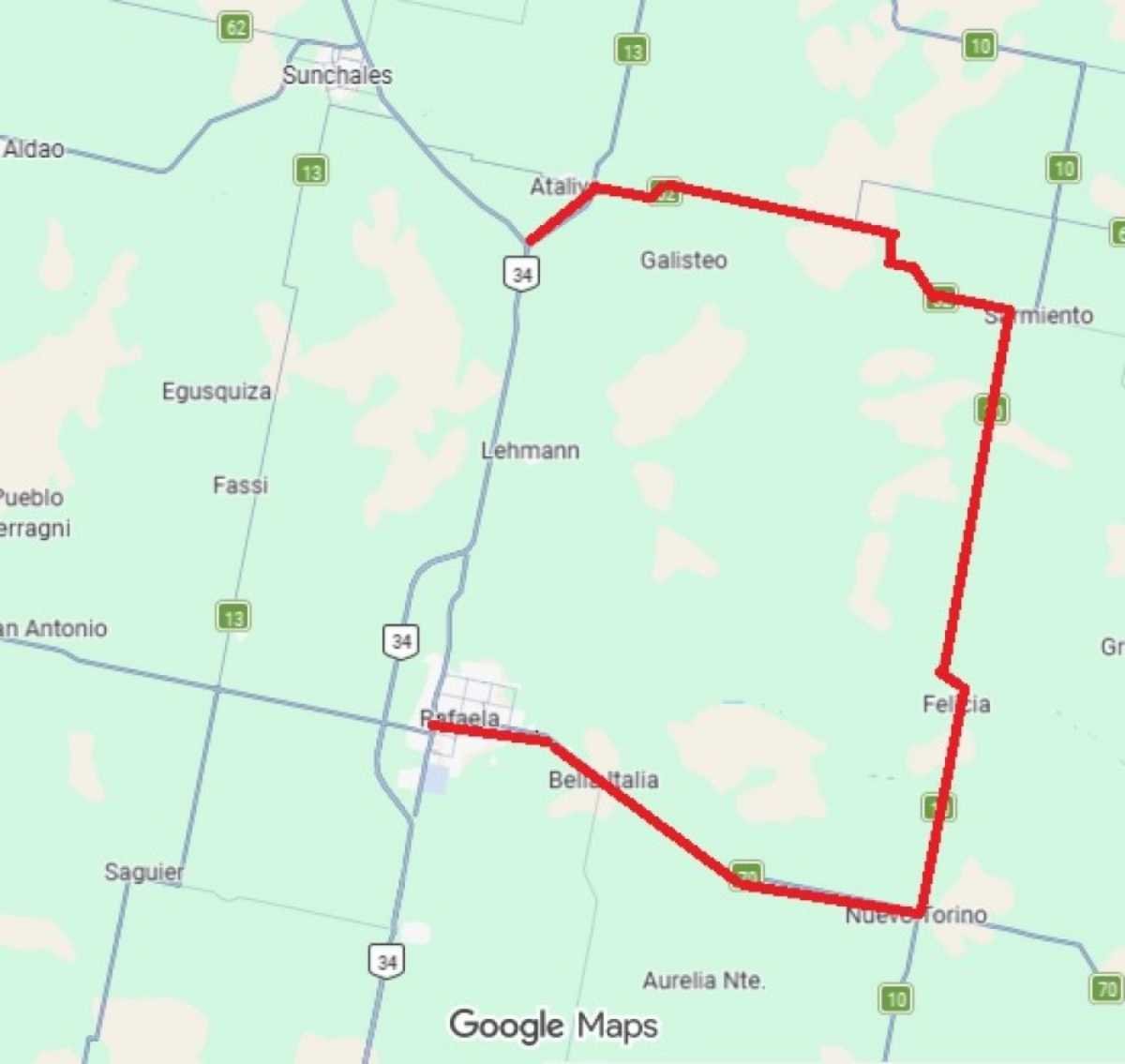 • En Nuevo Torino, tomar la Ruta Provincial 70 hacia el oeste (derecha), pasando por Bella Italia para reingresar a Rafaela.