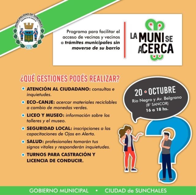 En los barriosBarrio SanCor SanCor: Llega el Programa Municipal «La Muni se Acerca» 20/10/2021 Por Redacción SH 20 Compartir FacebookXWhatsAppEmail El Programa Municipal «La Muni se Acerca» estará presente este miércoles por la tarde en el barrio SanCor. Las oficinas móviles de la actual gestión municipal se ubicarán en la intersección de avenida Belgrano y calle Río Negro, de 16 a 18 horas. TemasEn los barriosSanCor Compartir FacebookXWhatsAppEmail Relacionadas Epe: Anticipan corte de energía para el domingo 06/02/2026 La Justicia confirmó la intervención judicial de SanCor CUL por ocultamiento de información 28/01/2026 EPE anticipa corte de energía para el domingo 23/01/2026 Ultimas noticias Jornada por la Democracia 19/03/2026 ARB F – F1: Las chicas de Unión arrancaron con un traspié 19/03/2026 A 70 años de Alpid 19/03/2026