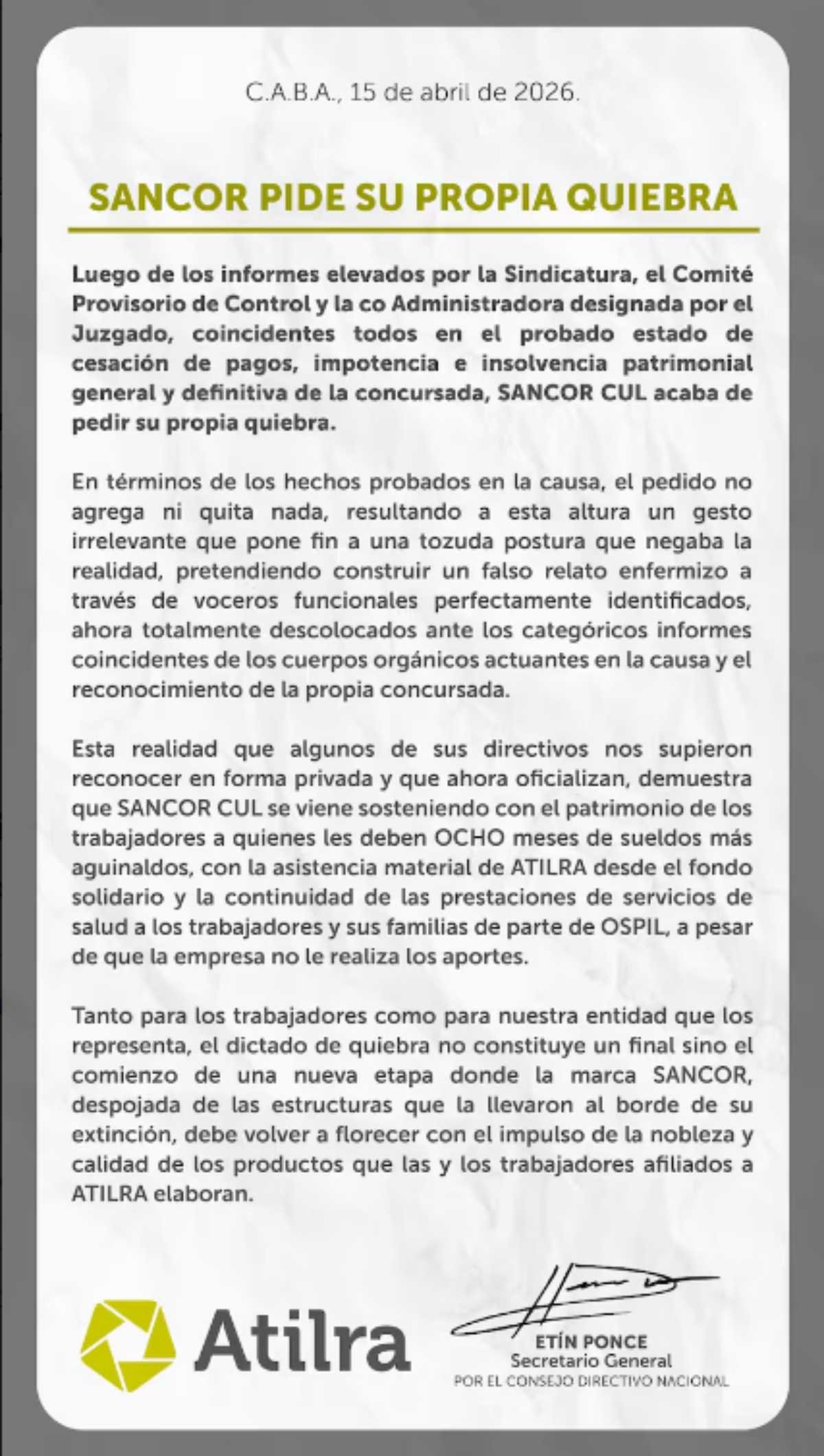 Para el sindicato, si la Justicia dicta la quiebra esto “no constituye un final sino el comienzo de una nueva etapa donde la marca SanCor, despojada de las estructuras que la llevaron al borde de su extinción, debe volver a florecer con el impulso de la nobleza y calidad de los productos que las y los trabajadores afiliados a Atilra elaboran”.