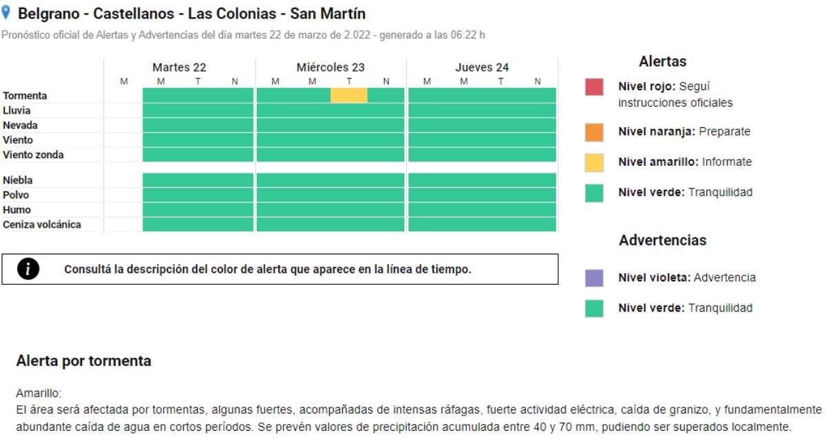 Pronóstico SAT: Alerta Amarillo para este miércoles por la tarde 22/03/2022 Por Redacción SH 126 Compartir FacebookTwitterWhatsAppEmail El Servicio Meteorológico Nacional emitió un Alerta Temprano de color Amarillo. El mismo tiene vigencia en la tarde de este miércoles, anticipándose la posible ocurrencia de tormentas fuertes con importante caída de agua. TemasAlerta AmarillopronósticoSATtormentas Compartir FacebookTwitterWhatsAppEmail Relacionadas SAT: Anticipan tormentas para la tarde de hoy 08/03/2026 SAT: Alerta Amarillo por tormentas para el martes 01/03/2026 SAT: Alerta Amarillo para esta noche 26/02/2026 Ultimas noticias Festram sin acuerdo y con dos jornadas de paro 09/03/2026 Robos varios del fin de semana 09/03/2026 Anses anunció un operativo especial en nuestra ciudad 09/03/2026