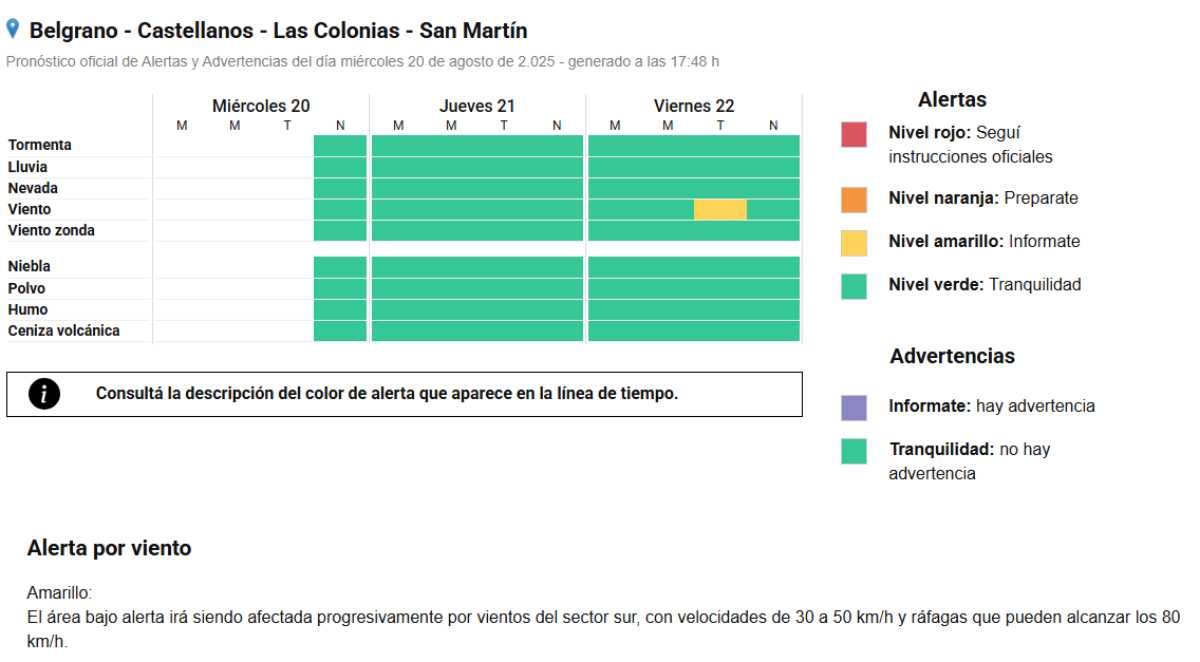 Interés general SAT: Alerta Amarillo por Vientos Fuertes 21/08/2025 Por Redacción SH 36 Compartir FacebookTwitterWhatsAppEmail El Servicio Meteorológico Nacional emitió un nuevo Alerta Meteorológico para la tarde de mañana viernes. El mismo, de nivel Amarillo, anticipa la posible ocurrencia de vientos fuertes que pueden llegar a registrarse en nuestra región. TemasAlerta AmarilloSATSMNvientos fuertes Compartir FacebookTwitterWhatsAppEmail Relacionadas SAT: Anticipan lluvias importantes 14/02/2026 SAT: Inestabilidad y Alerta por tormentas 05/02/2026 SAT: Alerta Amarillo por tormenta 31/01/2026 Ultimas noticias Zwi Migdal: la imagen del espanto (Sexta parte) 18/02/2026 Mal uso y abuso del verbo: Arrancar 16/02/2026 Carnavales: Reprogramados para mañana martes y con nuevo horario de inicio 16/02/2026