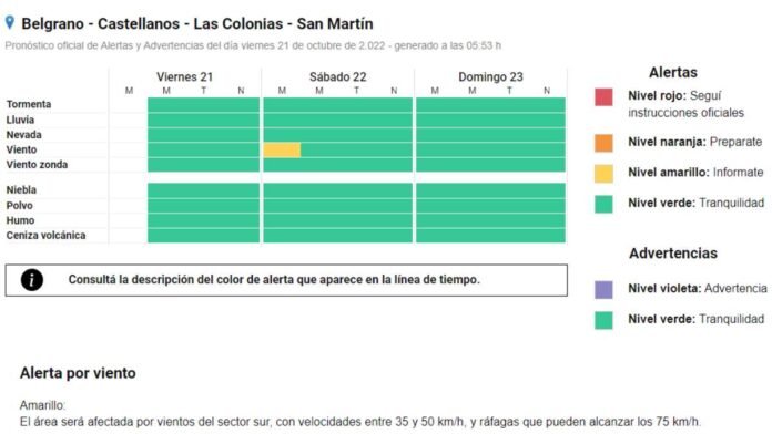 Pronóstico SAT: Alerta Amarillo por vientos y tormentas para el sábado por la mañana 21/10/2022 Por Redacción SH 73 Compartir FacebookTwitterWhatsAppEmail El Servicio Meteorológico Nacional emitió un Alerta Amarillo a través de su Sistema Temprano, anticipando malas condiciones climáticas para este sábado por la mañana. El alerta incluye posibles vientos de entre 35 y 50 kilómetros por hora. TemasAlerta AmarillopronósticoSATtormentasvientos Compartir FacebookTwitterWhatsAppEmail Relacionadas SAT: Alerta Naranja para esta noche 18/02/2026 SAT: Anticipan lluvias importantes 14/02/2026 SAT: Inestabilidad y Alerta por tormentas 05/02/2026 Ultimas noticias Medidas alternativas para tres sunchalenses que se resistieron al accionar policial en el Carnaval 18/02/2026 Carnavales 2026: Una propuesta que se sostiene a futuro con entrega y colorido 18/02/2026 SAT: Alerta Naranja para esta noche 18/02/2026