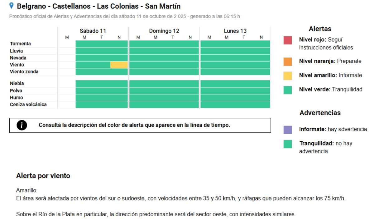 Interés general SAT: Alerta por vientos para la noche 11/10/2025 Por Redacción SH 43 Compartir FacebookXWhatsAppEmail El Servicio Meteorológico Nacional anticipa para las próximas horas el desmejoramiento de las condiciones climáticas, con probabilidad de precipitaciones y un Alerta Amarillo por vientos fuertes que tendría vigencia en la noche. TemasAlerta AmarilloSATSMNvientos fuertes Compartir FacebookXWhatsAppEmail Relacionadas SAT: Alerta por lluvias para el martes 15/03/2026 SAT: Anticipan tormentas para la tarde de hoy 08/03/2026 SAT: Alerta Amarillo por tormentas para el martes 01/03/2026 Ultimas noticias ARB F – F2: Libertad comenzó ganando 21/03/2026 ARB – F2: Buen triunfo de Unión sobre la BH 21/03/2026 SAT: Alerta por vientos para la tarde 21/03/2026