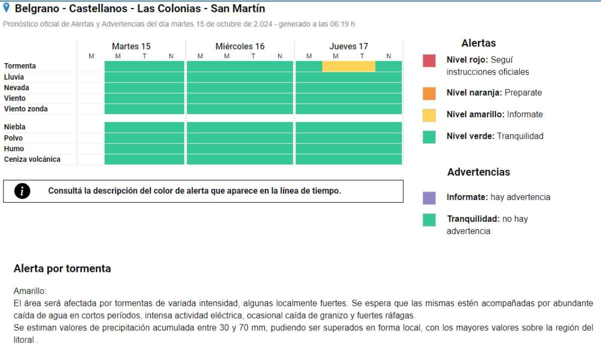 El Servicio Meteorológico Nacional emitió un nuevo Alerta Temprano ante la posible ocurrencia de tormentas fuertes que podrían registrarse en la zona el próximo jueves. En este caso, la advertencia abarca tanto la mañana como la tarde de dicha jornada.
