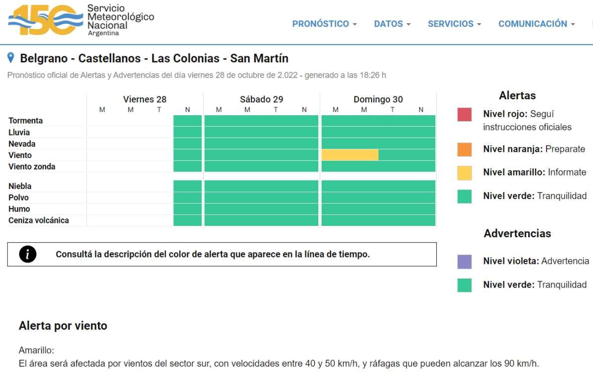 Pronóstico SAT: Alerta Temprana por vientos para el domingo 29/10/2022 Por Redacción SH 71 Compartir FacebookTwitterWhatsAppEmail El Sistema de Alerta Temprana ha emitido para este domingo un Alerta Amarillo ante la posible ocurrencia de vientos de carácter fuertes que pueden registrarse en la ciudad y región. La previsión es para la madrugada y mañana de esa jornada. TemasAlerta AmarillopronósticoSATservicio meteorológico nacionalSMN Compartir FacebookTwitterWhatsAppEmail Relacionadas SAT: Alerta Amarillo por tormentas para el martes 01/03/2026 SAT: Alerta Amarillo para esta noche 26/02/2026 SAT: Alerta Naranja para esta noche 18/02/2026 Ultimas noticias AMB – F1: Libertad comenzó ganando ante 9 de Julio de Morteros 07/03/2026 Guaycurúes con actividad oficial 06/03/2026 Actividades parroquiales 06/03/2026