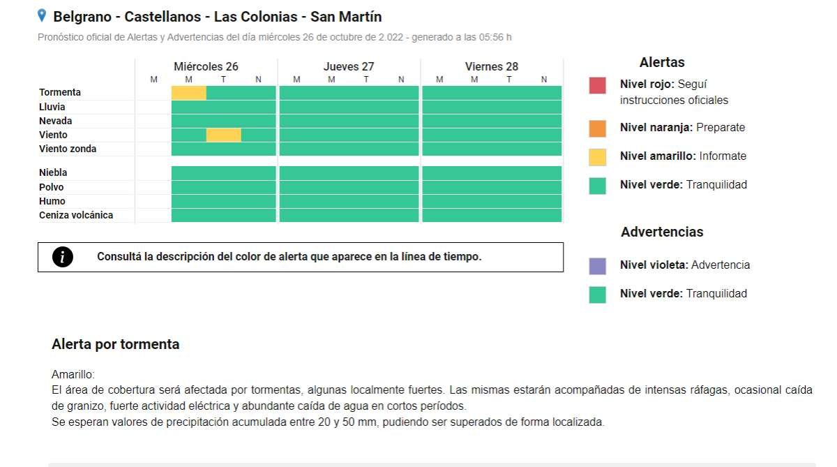 Pronóstico SAT: Renuevan el Alerta Amarillo por fuertes vientos para la tarde 26/10/2022 Por Redacción SH 115 Compartir FacebookTwitterWhatsAppEmail El Servicio Meteorológico Nacional ha emitido un nuevo Alerta Amarillo ante la posible ocurrencia de vientos fuertes en horas de la tarde de hoy, los mismos podrían ser de 30 a 50 km/h, llegando a tener ráfagas de 75 km/h. TemasAlerta AmarillopronósticoSMN Compartir FacebookTwitterWhatsAppEmail Relacionadas SAT: Alerta Amarillo por tormentas para el martes 01/03/2026 SAT: Alerta Amarillo para esta noche 26/02/2026 SAT: Alerta Naranja para esta noche 18/02/2026 Ultimas noticias AMB – F1: Libertad comenzó ganando ante 9 de Julio de Morteros 07/03/2026 Guaycurúes con actividad oficial 06/03/2026 Actividades parroquiales 06/03/2026