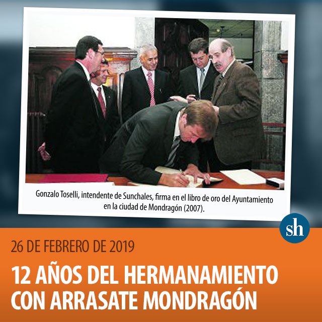 Finalmente, el Hermanamiento entre Sunchales y Arrasate se rubricó el lunes 26 de febrero de 2007 en Arrasate. La delegación argentina que asistió a la firma del hermanamiento estuvo compuesta por: el por entonces Intendente Gonzalo Toselli, Marcelo Ghione, presidente del Concejo Municipal de Sunchales; Carlos G. Palacino Antia, presidente de la Alianza Cooperativa Internacional de las Américas y presidente ejecutivo de Saludcoop EPS; Raúl Colombetti, presidente de Casa Cooperativa de Provisión Sunchales Ltda; Rubén Sánchez, de la Aseguradora de Riesgos del Trabajo del Grupo Sancor Seguros; Javier Di Biase, gerente de Organización y Auditoría del Grupo Sancor Seguros; y Ramón Peirotti, funcionario de la Asociación Mutual Personal Sancor Lácteos y miembro del Consejo Asesor de Casa Cooperativa.