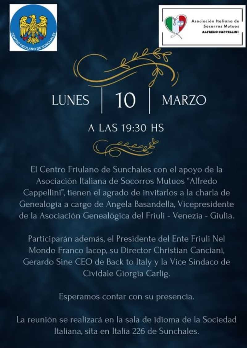 Sociedad Sociedad Italiana: Charla sobre Genealogía 09/03/2025 Por Redacción SH 47 Compartir FacebookTwitterWhatsAppEmail Desde el Centro Friulano, que funciona en la Sociedad Italiana de nuestra ciudad, se invita a participar este lunes, de la charla de Genealogía que ofrecerá Ángela Basandella, Vicepresidente de la Asociación Genealógica del friuli, Venezia. TemasCentro Friulanogenealogíasociedad italiana Compartir FacebookTwitterWhatsAppEmail Relacionadas Fue un viaje al ayer 22/10/2025 Llega la muestra «Argentina, tierra de inmigrantes» 13/10/2025 Patrimonio de la memoria 06/10/2025 Ultimas noticias SAT: Alerta Amarillo por tormenta 31/01/2026 Box: Pelea Eliana Orecchia 31/01/2026 Teatro: herramienta poderosa para la reflexión y expresión social (III) 31/01/2026