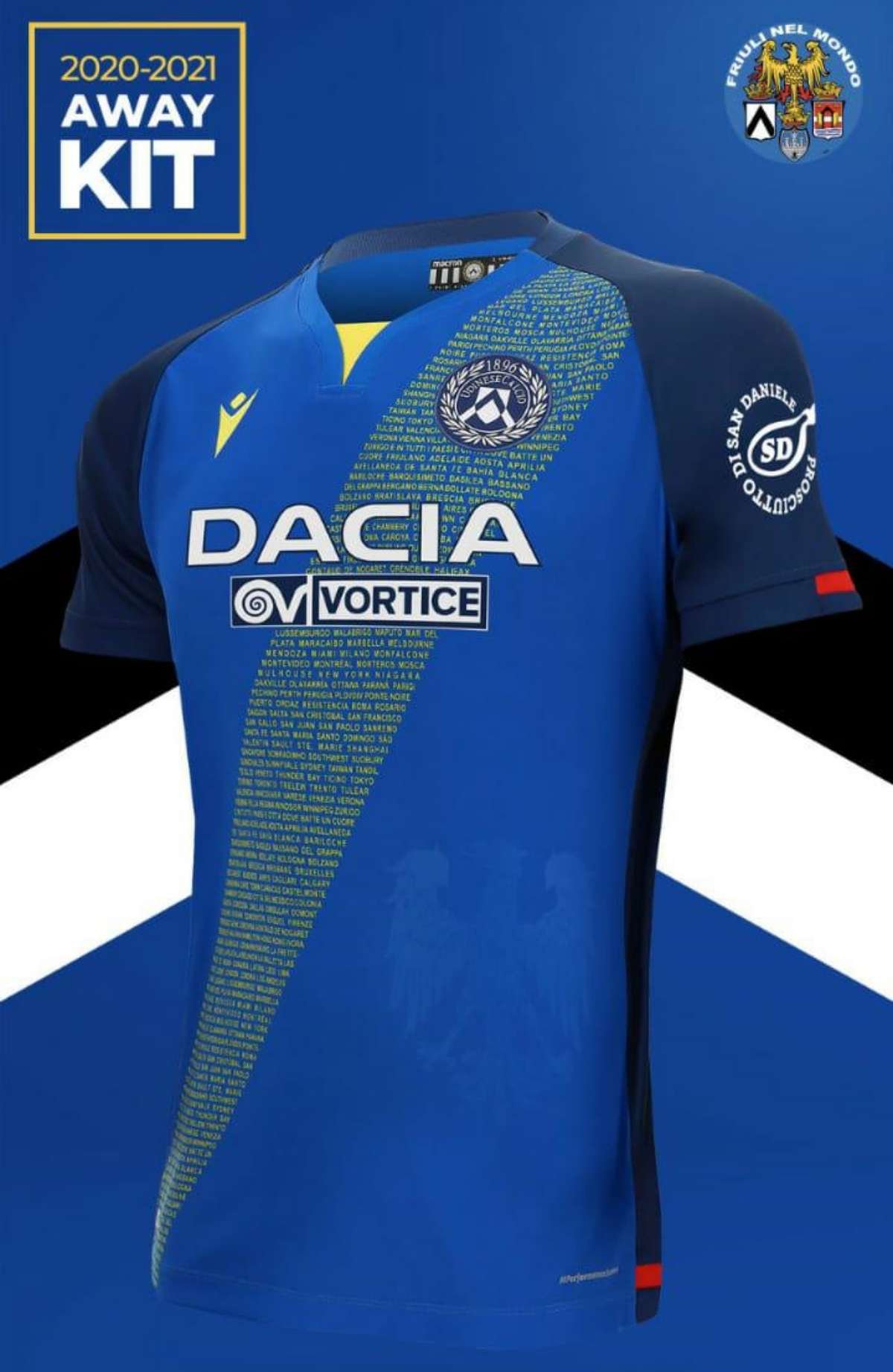 Se trata de la diagramación de su camiseta alternativa, la cual cuenta con los colores azul y amarillo -propios de la bandera del Friuli- pero que a su vez, ostenta una franja diagonal en la cual están impresos los nombres de las 140 ciudades del mundo que actualmente tienen Centros Friulanos.