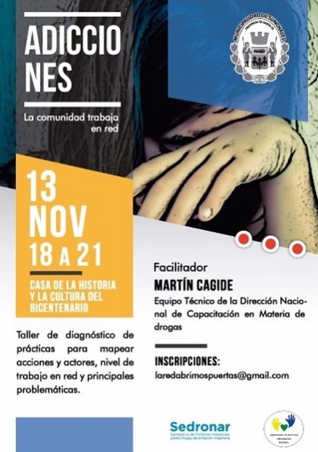 La Municipalidad de Sunchales, a través de la Secretaría de Desarrollo Humano y de la red «Abrimos Puertas, Creamos Redes», invita a participar de un taller titulado «Adicciones. La comunidad trabaja en red». El mismo se realizará el venidero lunes 13, de 18 a 21, en Casa de la Historia y la Cultura del Bicentenario (Pasteur, esquina Rotania).