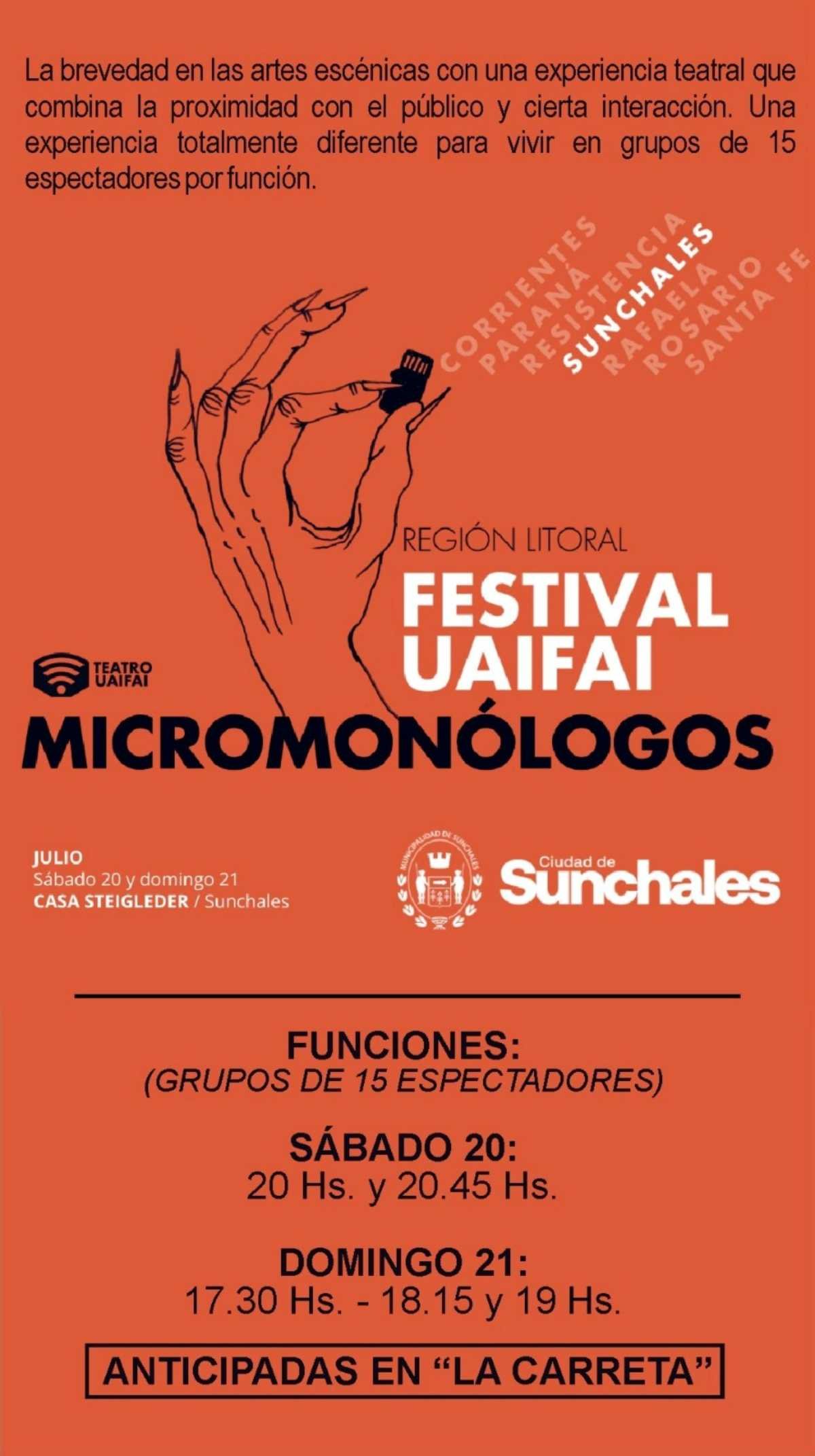 El Festival UAIFAI de Micromonólogos se está realizando en 2024 en siete ciudades de la región litoral: en junio se presentó en Corrientes, Paraná y Resistencia, en julio lo hará en Sunchales, y en agosto en Rafaela, Santa Fe y Rosario, en un esfuerzo de producción colectivo, Federal y autogestivo.