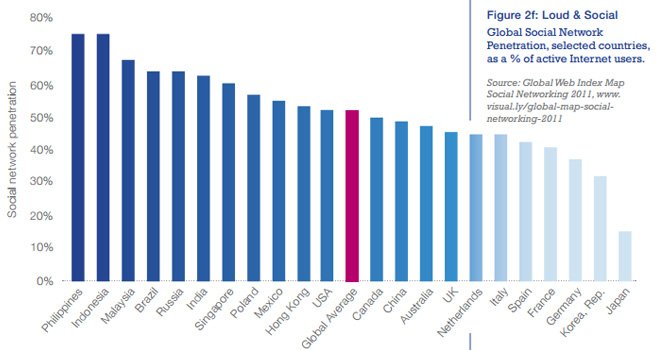 También se indican los países con mayor penetración de redes sociales, como porcentaje de la cantidad de usuarios activos de internet: