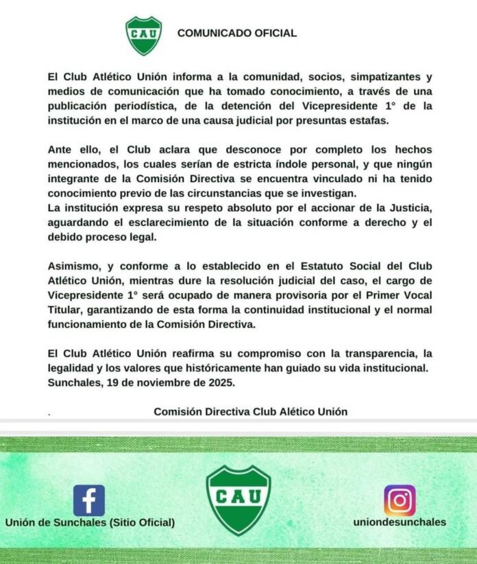 Desde el club Atlético Unión se emitió un comunicado oficial acerca de la detención de quien fuera recientemente designado para ocupar el cargo de Vicepresidente 1º.