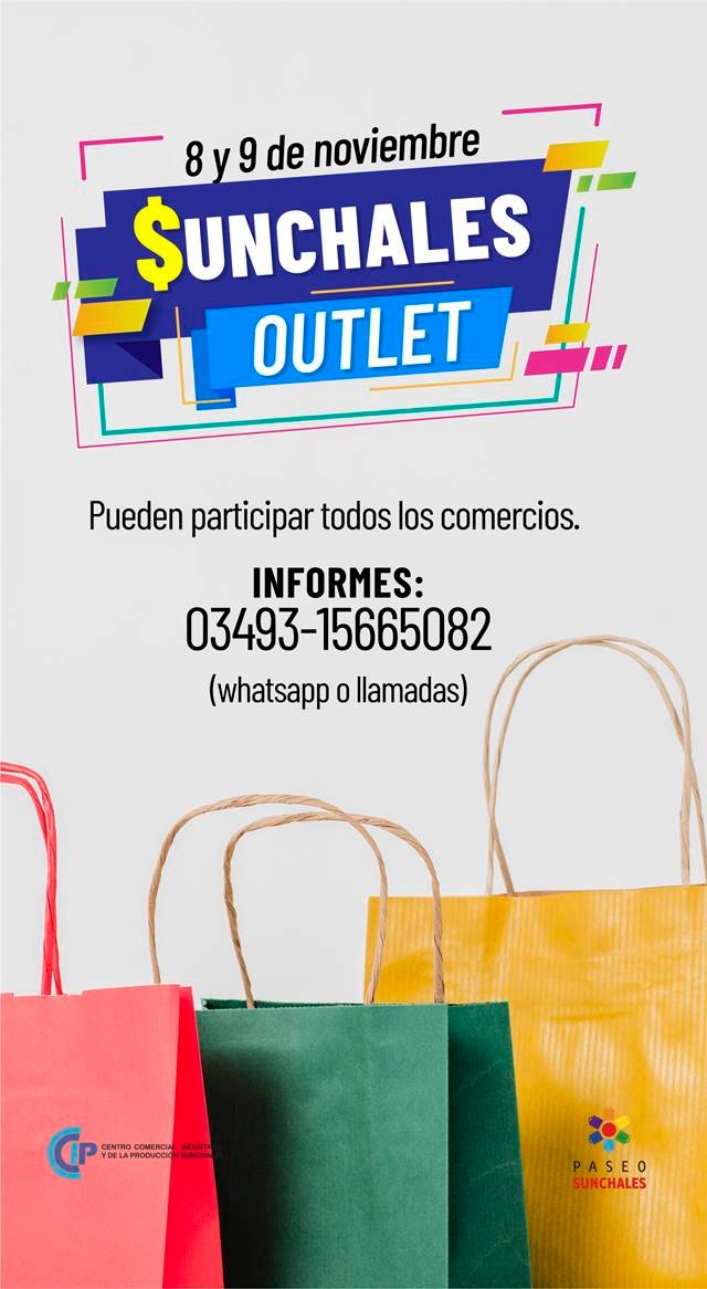 Desde el Centro Comercial informaron que, este viernes y sábado se organizará un Outlet en la ciudad. Por dicho motivo, cada comercio recibirá un kit compuesto de 10 metros de Banderines y Cinta demarcadora ancha (20 cm) con leyenda: «Sunchales Outlet», para decorar su local, vereda o vidriera.