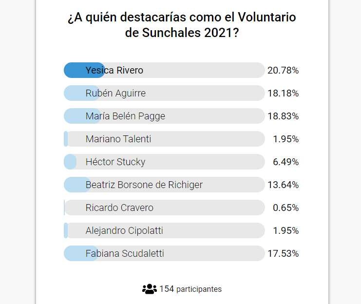 Fueron 154 los votos recibidos en la plataforma municipal, tras cuyo cierre, se determinó que fuera Yésica Rivero la reconocida en este año 2021. Más allá de esto, en todo momento se dejó en claro que se trata de un reconocimiento que recae sobre una persona pero son todos los postulados merecedores de este agradecimiento comunitario.