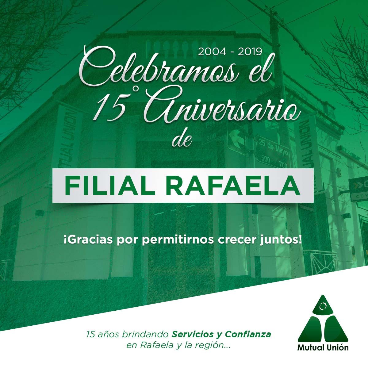 Celebramos los 15 años de esta pujante filial, que permite a los asociados e integrantes de las comunidades de la vecina ciudad y su región beneficiarse con los servicios de la entidad mutualista albiverde.