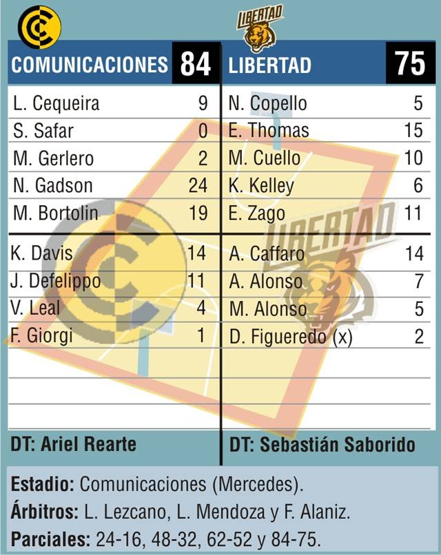 En el último cuarto Libertad tuvo a Caffaro como estandarte para quedó a tiro (69-66) promediando el período. Sin embargo, entre Gadson, Bortolín y Davis se encargaron de apagar las ilusiones del visitante y festejó “Comu”.