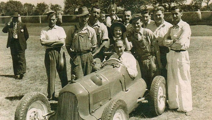 Primera carrera oficial de midgets, año 1948. Primo Ré (con sombrero), el Dr. Marqués (en el auto) y Vicente Cipolatti (con gorra). Foto: Libro «La esencia del midget palpita en Sunchales», 2013.