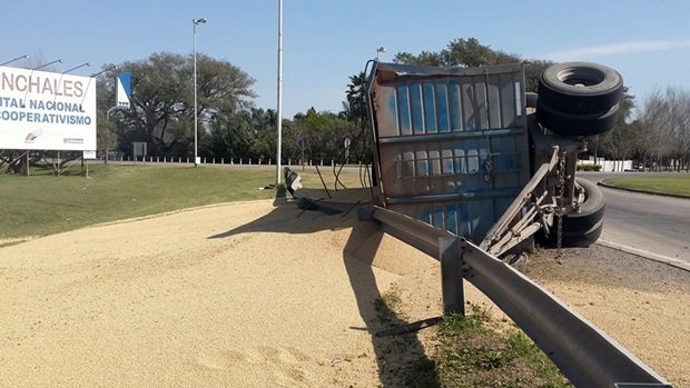 De acuerdo a las primeras informaciones, el suceso tuvo lugar cuando el vehículo estaba circulando por la rotonda, generándose una falla en los frenos. Esto habría provocado la pérdida de estabilidad del camión y el posterior vuelco, derramando la carga en las inmediaciones.