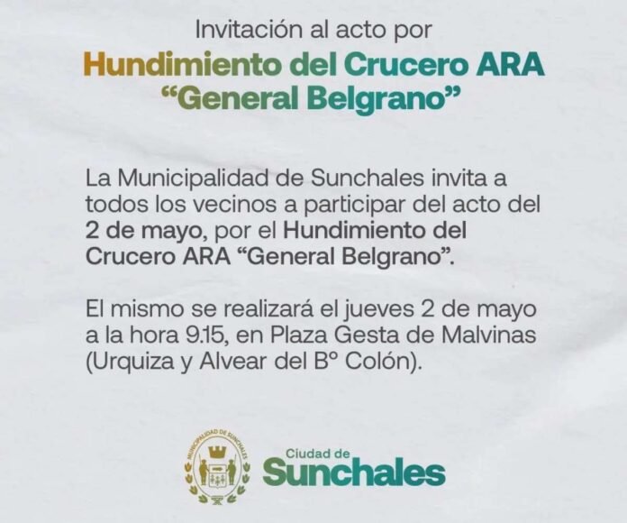 Sociedad Acto por el hundimiento del ARA «General Belgrano» 01/05/2024 Por Redacción SH 21 Compartir FacebookTwitterWhatsAppEmail El Municipio informó que mañana jueves realizará el acto oficial en recuerdo al hundimiento del crucero ARA «General Belgrano». El mismo se desarrollará en la plaza «Gesta de Malvinas», del barrio Colón. TemasactoARA General BelgranoMalvinasMunicipalidad Compartir FacebookTwitterWhatsAppEmail Relacionadas El Municipio incorporó 64 nuevas columnas para alumbrado público 29/01/2026 Suspendieron el paro de Municipales 28/01/2026 A 75 años del nacimiento de Owen Crippa 27/01/2026 Ultimas noticias LMB: Libertad debuta ante el 9 de Morteros 11/02/2026 Copa Departamento: Mañana se juega la revancha del clásico local 11/02/2026 Eempa: Inscripciones abiertas 10/02/2026