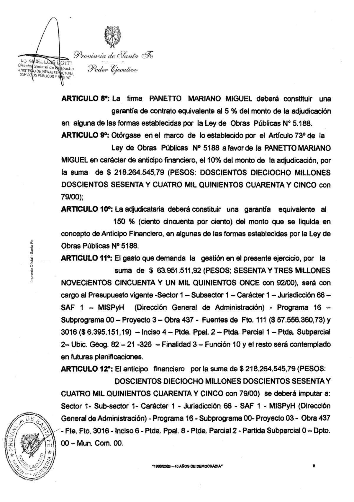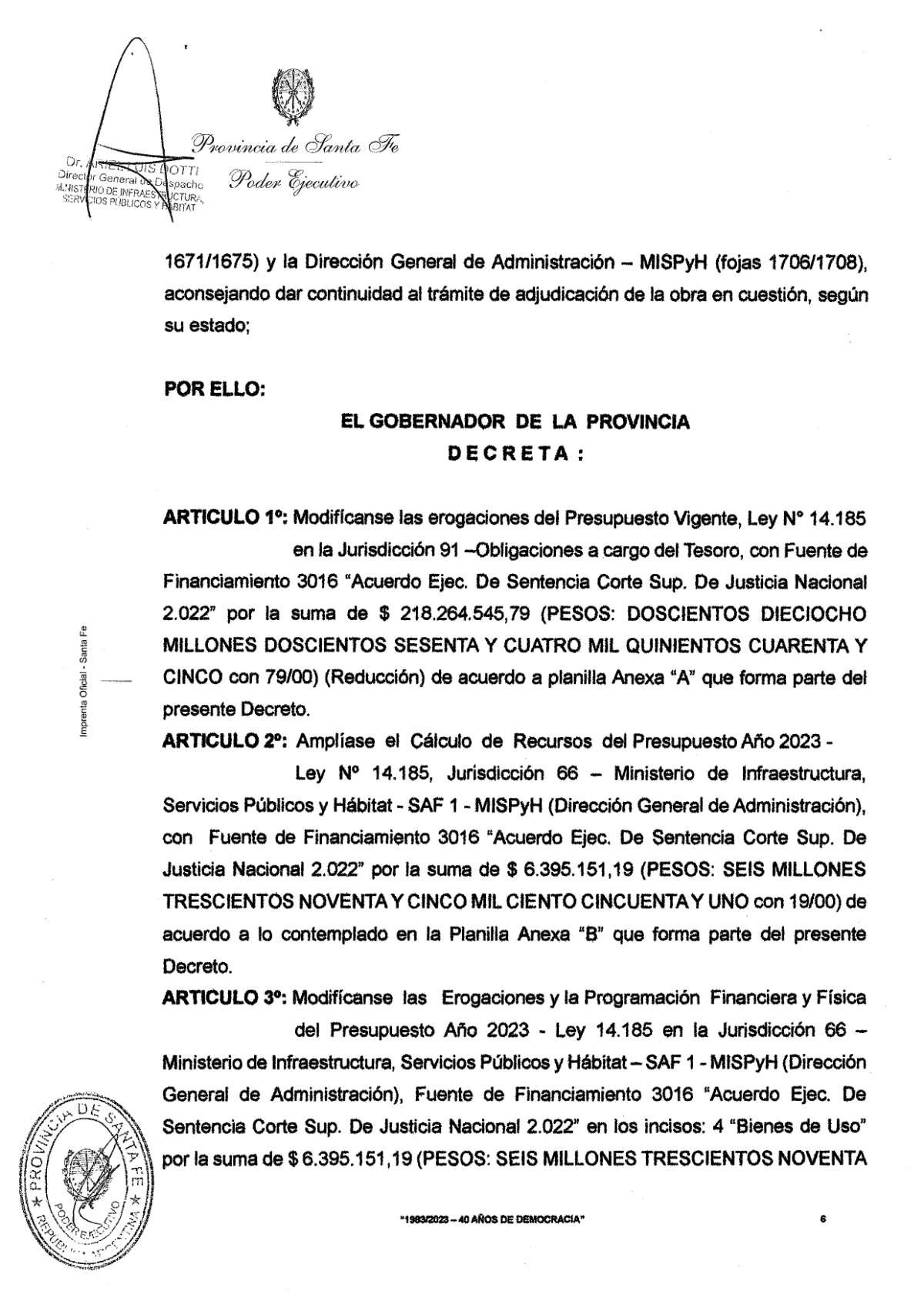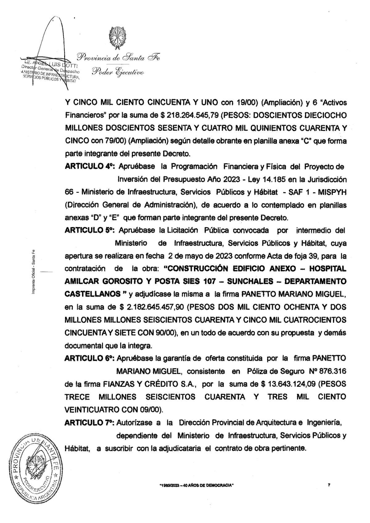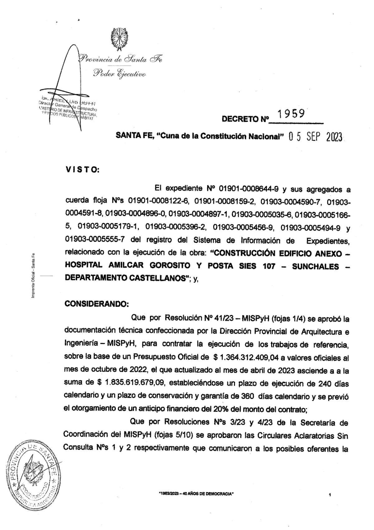 Mediante la firma del Decreto Nº 1959, el Gobierno de la Provincia informó sobre el mediodía de hoy la aprobación de la Licitación Pública que fuera convocada por el Ministerio de Infraestructura, Servicios Públicos y Hábitat para la contratación de la obra: «Construcción del Edificio Anexo – Hospital Almícar Gorosito y Posta Sies 107- Sunchales».