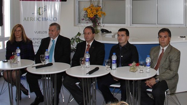 En la rueda de prensa, participaron Patricia Rey en representación de Aerochaco; Norberto Cipollatti, Director Asuntos Institucionales Grupo Sancor Seguros; el Intendente Ezequiel Bolatti; Carlos Cobas, Gerente Comercial Macair Jet y Julio Arisio, Jefe del Aeródromo.