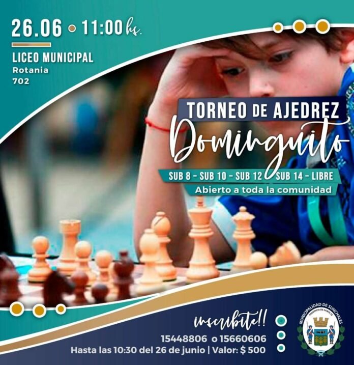 La Municipalidad de Sunchales informó que el próximo domingo 26 se desarrollará una nueva fecha del tradicional torneo de Ajedrez «Dominguito». Se trata del segundo Torneo del Calendario Oficial de competencia de la Federación Rafaelina de Ajedrez 2022.
