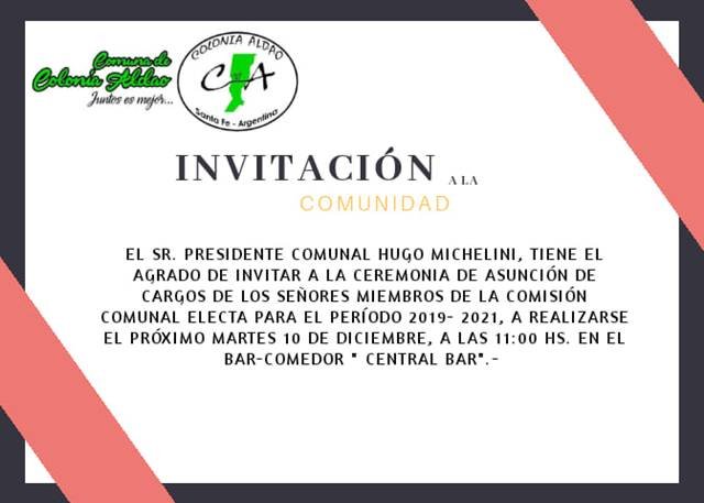 RegiónAldao Aldao: Asunción de autoridades locales 06/12/2019 Por Redacción SH 552 Compartir FacebookXWhatsAppEmail Con Hugo Michelini a la cabeza por un nuevo período, el martes venidero se producirá el acto en donde tomarán posesión las nuevas autoridades de Colonia Aldao. TemasAldaoHugo Michelini Compartir FacebookXWhatsAppEmail Relacionadas LRF – F14: Ganó Unión, perdió Libertad 07/11/2025 Regional Amateur – F3: Designaciones para los sunchalenses 06/11/2025 Regional Amateur: Todo listo para el inicio 09/10/2025 Ultimas noticias ARB – F3: Triunfo de Unión en San Cristóbal 30/03/2026 A 41 años de la creación de Radio Sunchales 30/03/2026 Ajedrez: Sunchalenses en el «Reynaldo Casabella» de Rafaela 30/03/2026