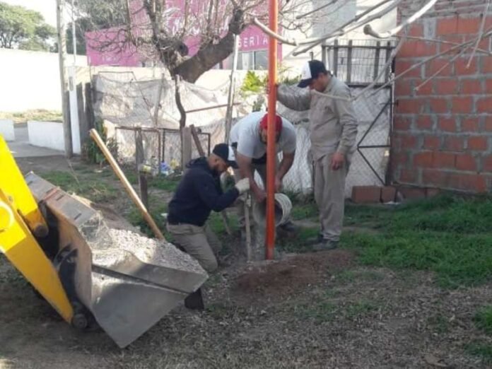 Personal de Corralón Comunal trabaja en la colocación de 12 nuevas columnas para su posterior instalación de proyectores led, sobre las calles: