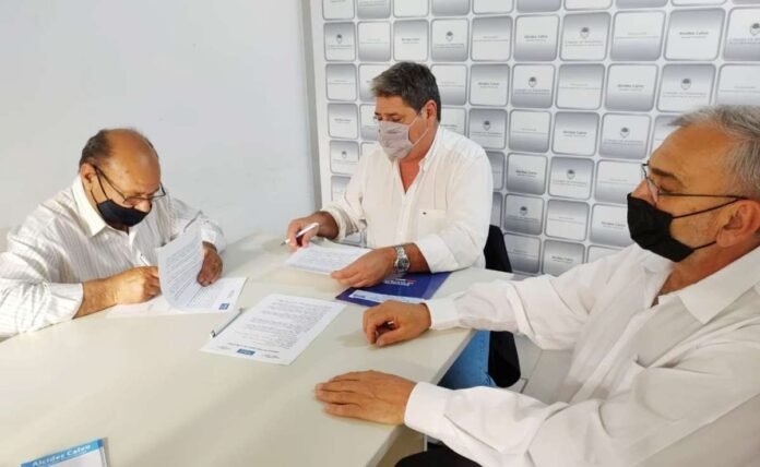 El senador provincial Alcides Calvo recibió a Carlos Maina, secretario de Empresas y Servicios Públicos de la Provincia de Santa Fe y a Hugo Michelini, Presidente Comunal de Colonia Aldao, para formalizar la firma de un convenio para ejecutar la red distribuidora de agua potable que llevará el servicio a familias e instituciones de la localidad.