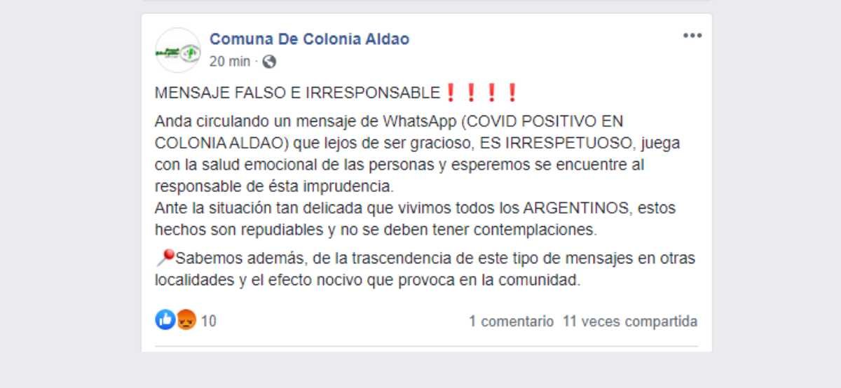 La Comuna de Colonia Aldao desmintió a través de sus redes sociales la circulación de un mensaje apócrifo en el cual se daba cuenta de la existencia de un caso positivo de Covid19 en dicha localidad.
