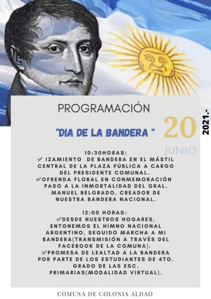 La Comuna de Colonia Aldao dio a conocer el cronograma de lo que será el Acto por el Día de la Bandera a concretarse el venidero domingo. El mismo tendrá una parte presencial y otra virtual, incluyendo la Jura a la Bandera por parte de estudiantes de Cuarto Grado.