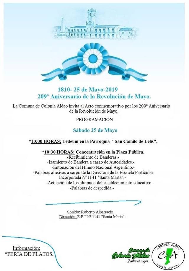 RegiónAldao Aldao: Preparativos para el acto del 25 de Mayo 20/05/2019 Por Redacción SH 1406 Compartir FacebookXWhatsAppEmail La Comuna de Colonia Aldao informó que el sábado se realizará el acto oficial por el 25 de Mayo. En la ocasión, además, habrá diferentes actividades y una Feria de Platos. TemasactoAldao Compartir FacebookXWhatsAppEmail Relacionadas Reconocerán a Voluntarios Sunchalenses 17/03/2026 Alas para la Vida cierra el ciclo escolar 2025 11/12/2025 LRF – F14: Ganó Unión, perdió Libertad 07/11/2025 Ultimas noticias ARB – F3: Triunfo de Unión en San Cristóbal 30/03/2026 A 41 años de la creación de Radio Sunchales 30/03/2026 Ajedrez: Sunchalenses en el «Reynaldo Casabella» de Rafaela 30/03/2026