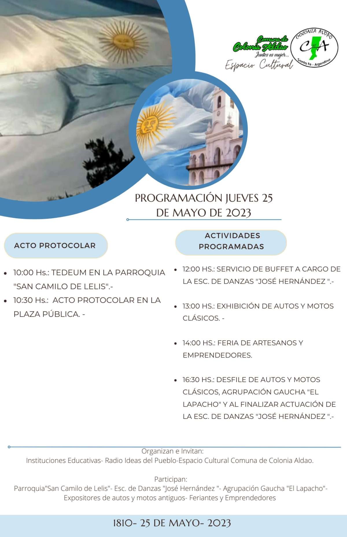 La Comuna de colonia Aldao difundió el cronograma de actividades que están organizándose para el venidero jueves 25 de Mayo, tanto en la parte oficial como así también en las actividades especiales que permitirán disfrutar de una jornada especial.
