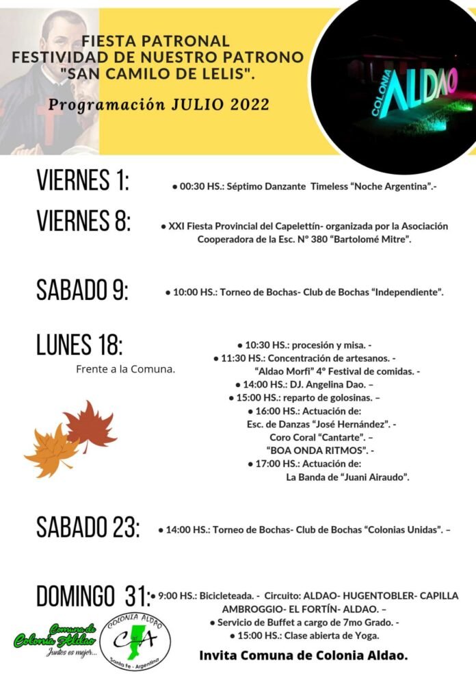 La Comuna de Colonia Aldao dio a conocer cómo se desarrollarán las diferentes actividades a lo largo del mes de julio. Las mismas servirán para enmarcar nuevos festejos patronales, destacándose varias propuestas culturales, sociales y deportivas a lo largo de las próximas semanas.
