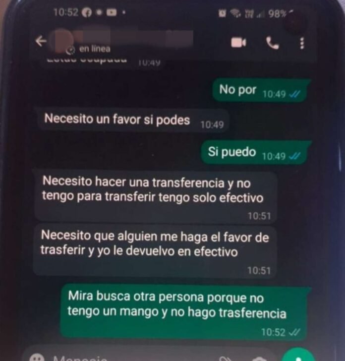 «Gente aviso me hackearon mi cuenta de WhatsApp están pidiendo plata x transferencia.. por favor no responder y me reportar mi cuenta de WhatsApp así automáticamente se bloquea la cuenta.. le mandan a mis contactos pidiendo transferencia«.