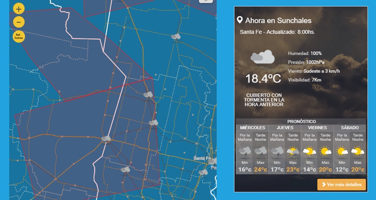 El parte del SMN expresa que «si bien sobre parte de la zona de cobertura se registran mejoramientos temporarios, se espera que durante el día de hoy el área vuelva a ser afectada por chaparrones y tormentas, algunas localmente fuertes provocando fundamentalmente abundante caída de agua, y en forma localizada fuerte actividad eléctrica, ráfagas y ocasional caída de granizo, con mejoramientos temporarios».