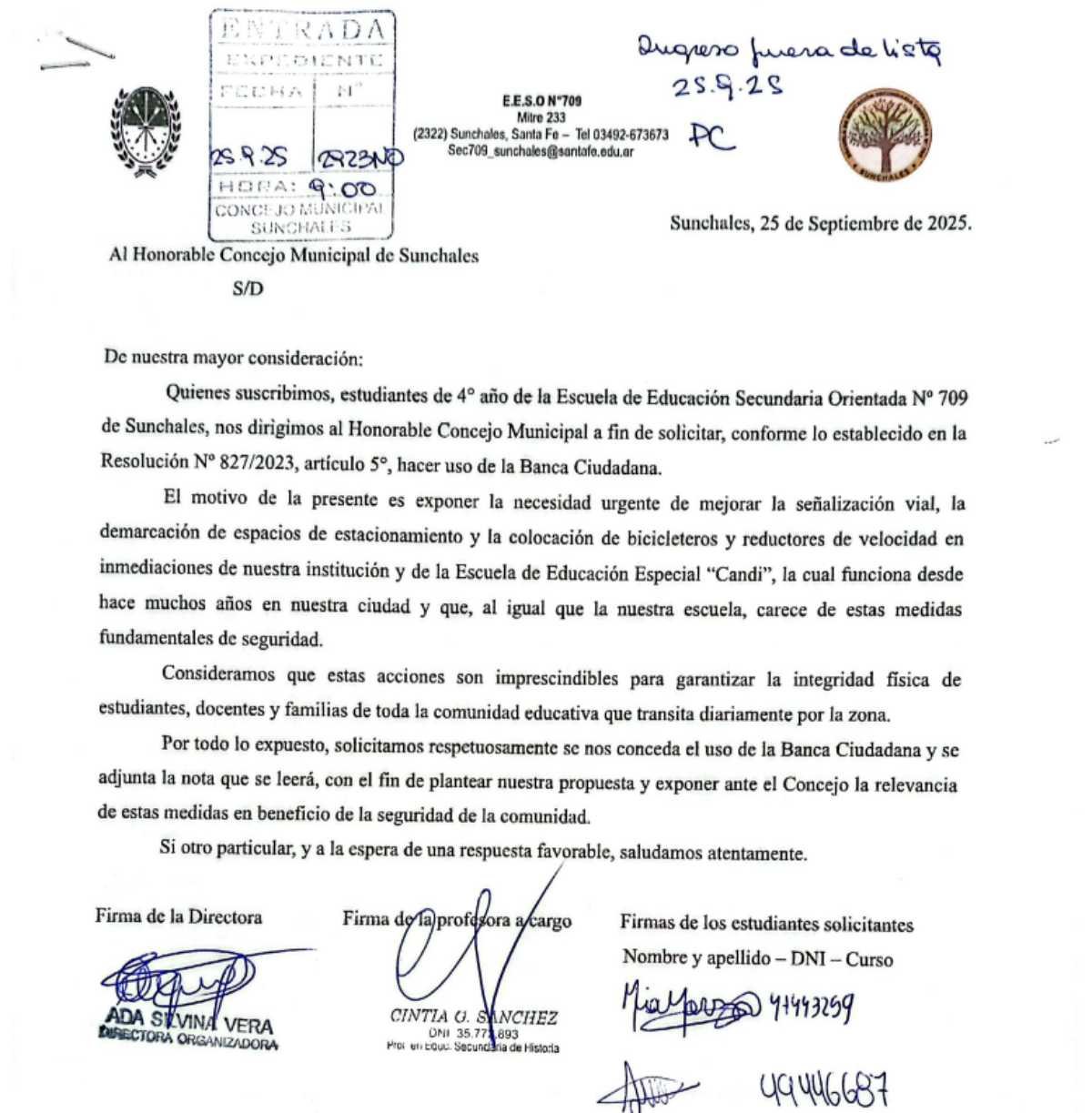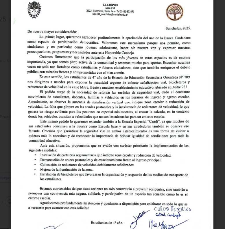 Los alumnos de Cuarto Año de la escuela secundaria Nº 709, enviaron una nota al Concejo para poder utilizar la Banca Ciudadana. A través de la misma, pretenden exponer complejas situaciones cotidianas relacionadas con el tránsito, que viven desde el traslado a su nuevo inmueble.