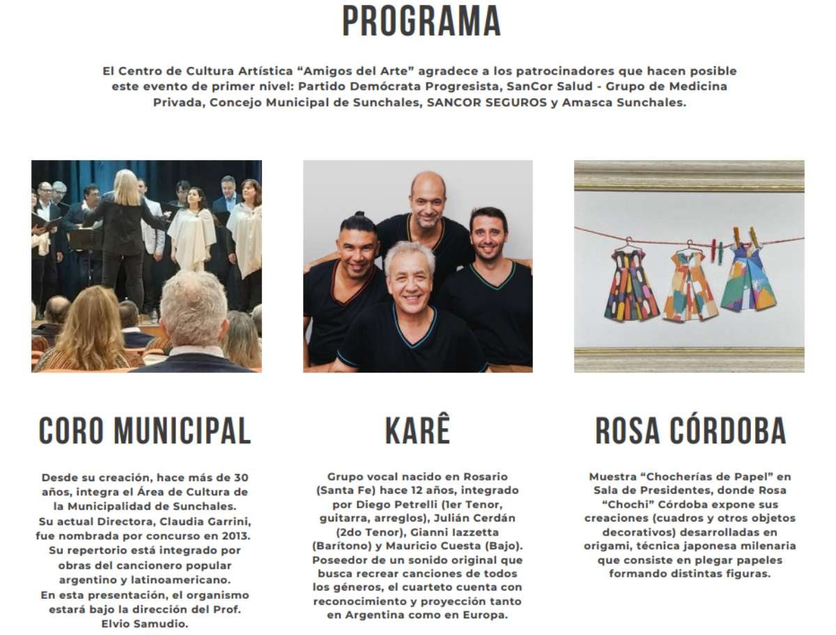 El sábado 24, por su parte, se presentará el Coro Municipal de la Ciudad de Sunchales (Directora: Claudia Garrini), como antesala de la actuación del reconocido cuarteto Karê. Desde su creación, hace más de 30 años, integra el Área de Cultura de la Municipalidad de Sunchales. El Coro actúa en eventos oficiales y también desarrolla una intensa actividad que el mismo grupo genera, como encuentros corales, cursos de perfeccionamiento con maestros invitados, talleres de técnica vocal y viajes a festivales en distintos lugares del país. Su repertorio está integrado, básicamente, por obras del cancionero popular argentino y latinoamericano. En esta presentación, el organismo estará bajo la dirección del profesor Elvio Samudio.