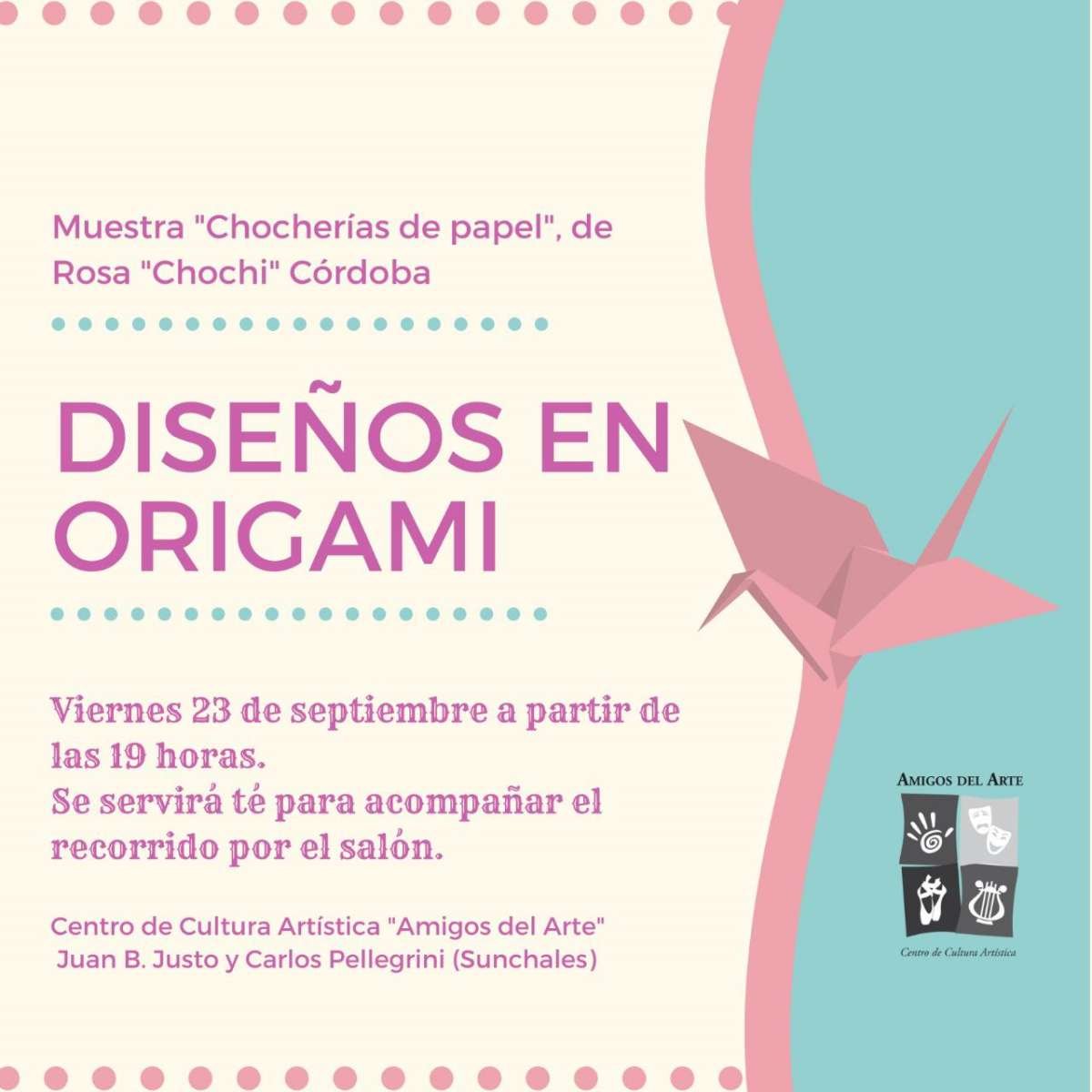 En primer lugar, continuando con el apoyo a artistas de Sunchales, el viernes 23 se habilitará la muestra “Chocherías de Papel”, donde Rosa “Chochi” Córdoba expondrá sus creaciones (cuadros y otros objetos decorativos) desarrolladas en origami, técnica japonesa milenaria que consiste en plegar papeles formando distintas figuras. Se servirá té para acompañar el recorrido por el salón y habrá una mesa con papeles y diagramas para que quienes asistan puedan hacer su propia figura. La exposición permanecerá abierta hasta el día siguiente.