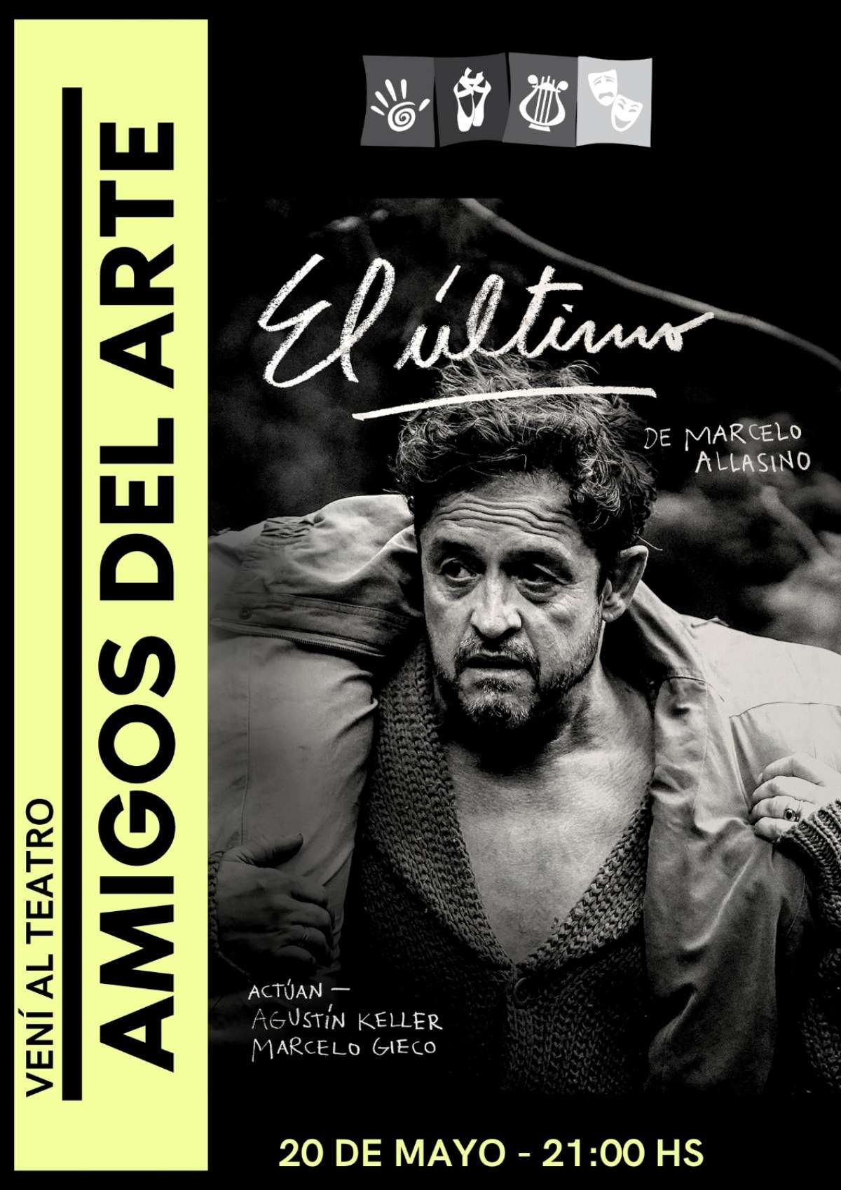 El Centro de Cultura Artística “Amigos del Arte” se complace en anunciar, dentro de su cartelera de actividades de mayo, la obra teatral “El último – Diatriba de amor por mensaje de audio” (ganadora del Concurso 2022 del Plan de Fomento del Ministerio de Cultura de la Provincia de Santa Fe), escrita y dirigida por Marcelo Allasino, reconocido artista oriundo de la ciudad de Rafaela.