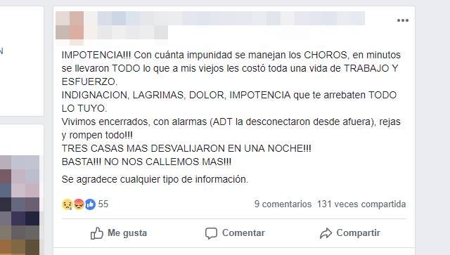 «Siento angustia e impotencia ya que estamos en una sociedad en la cual te roban y luego te dicen que no se puede hacer nada», dijo en primera instancia, señalando que a su entender «la Policía sabe quiénes son porque se trata siempre del mismo grupo de gente».