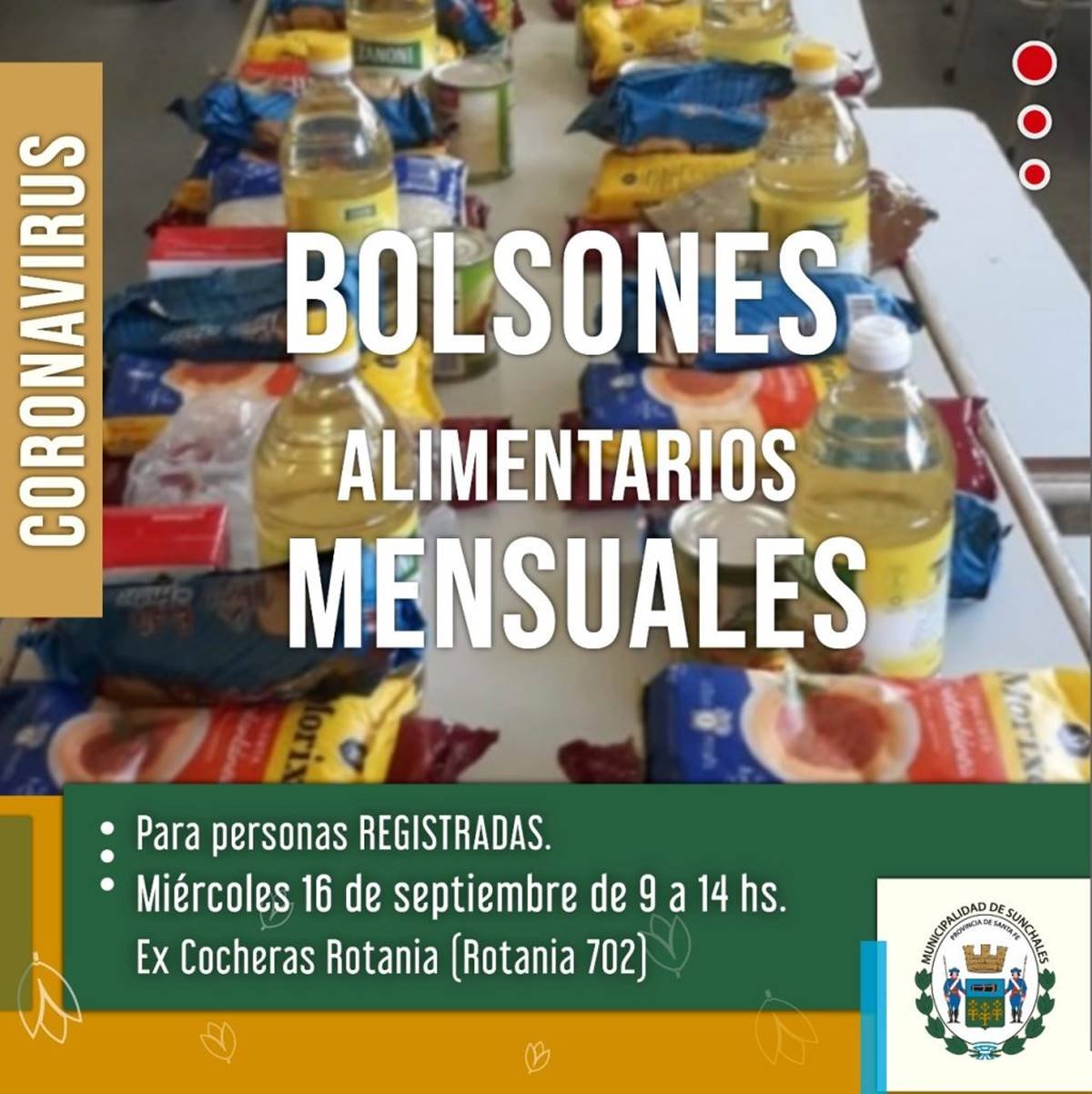 La Municipalidad comunica a los beneficiarios, que este miércoles se realizará la entrega de los Bolsones Alimentarios Mensuales. La actividad se realizará en las ex Cocheras Rotania, ubicada en Rotania 702, mientras que el día jueves 17, en el Jardín Claudio Ugalde, ubicado en Ameghino 767, se entregarán las cajas diferenciadas, nutrir y de huerta.