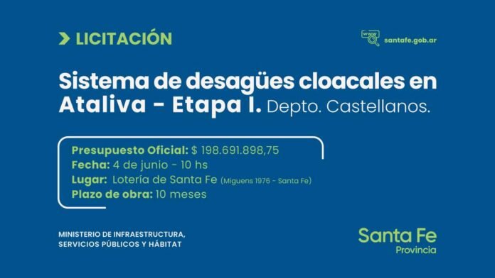 (Por: Prensa Provincia) – A través de la Secretaría de Empresas y Servicios Públicos, dependiente del Ministerio de Infraestructura, Servicios Públicos y Hábitat, se realizará la licitación para la Construcción del sistema de desagües cloacales, en la localidad de Ataliva, departamento Castellanos. El acto licitatorio se llevará a cabo este viernes, a las 10, en las dependencias de la sala de sorteos de la Lotería de Santa Fe, sita en calle Francisco Miguens Nº 1976 de la ciudad de Santa Fe, y bajo la modalidad virtual por el facebook del Ministerio de Infraestructura: @MISPHsf.
