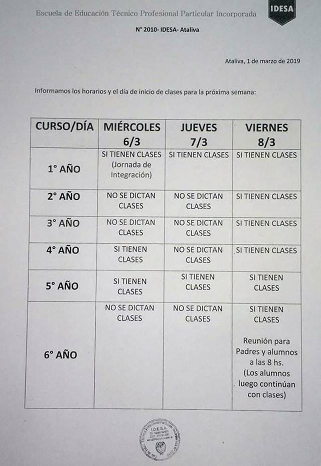 Ataliva Ataliva: Idesa anticipa el dictado de clases de esta semana 03/03/2019 Por Redacción SH 812 Compartir FacebookXWhatsAppEmail Desde Idesa anticiparon cómo será el cronograma de dictado de clases en el transcurso de la semana para los diferentes cursos que forman parte del ciclo lectivo 2019. TemasatalivaclasesIdesa Compartir FacebookXWhatsAppEmail Relacionadas Las instituciones se preparan para el inicio del ciclo lectivo 24/02/2026 De eso no se habla: Otro inicio de clases sin ciclovías 14/02/2026 Ataliva y los 125 años de su escuela 18/09/2025 Ultimas noticias EPE: Anticipa corte de energía para mañana sábado 20/03/2026 Jornada por la Democracia 19/03/2026 ARB F – F1: Las chicas de Unión arrancaron con un traspié 19/03/2026