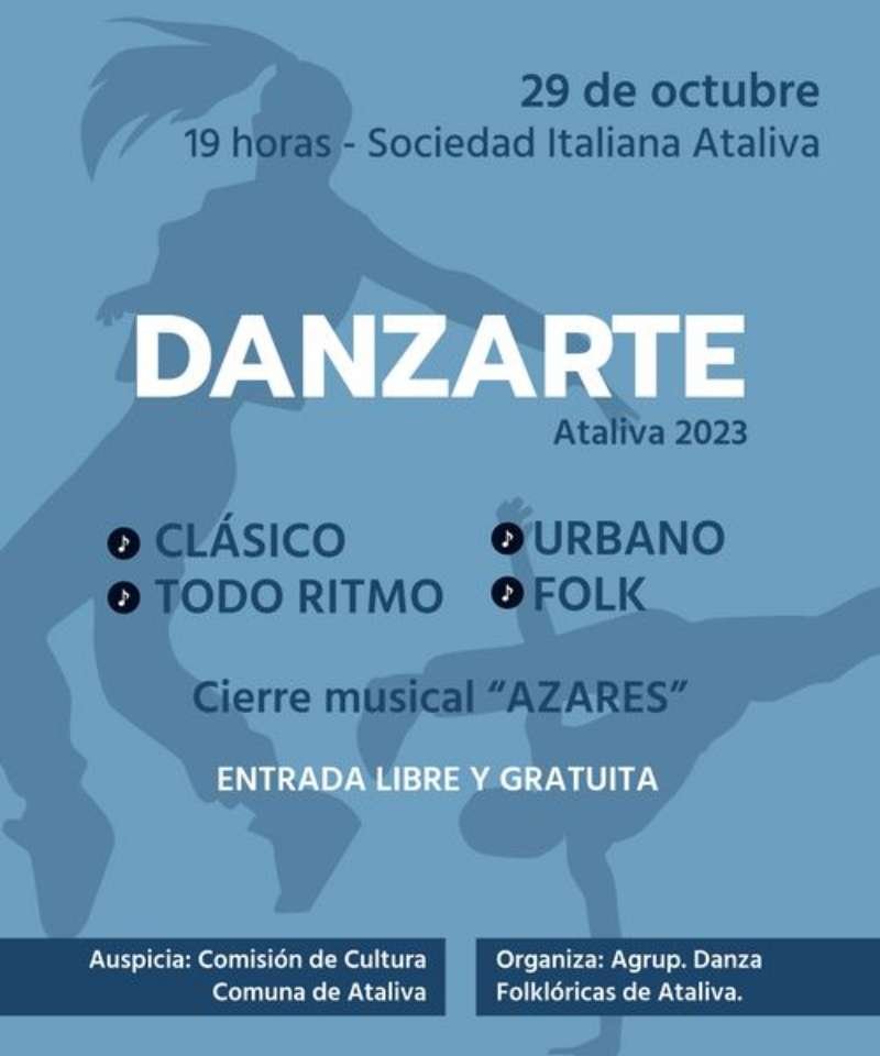 RegiónAtaliva Ataliva: Organizan el Danzarte 2023 24/10/2023 Por Redacción SH 26 Compartir FacebookTwitterWhatsAppEmail Desde la Comuna de Ataliva se informó que el próximo 29 de octubre se realizará la edición 2023 del Danzarte, evento que reúne a distintas manifestaciones de ritmos. TemasatalivaDanzarte Compartir FacebookTwitterWhatsAppEmail Relacionadas Ataliva y los 125 años de su escuela 18/09/2025 Ataliva y sus 125 años 16/09/2025 Ataliva y sus festejos Patronales 13/08/2025 Ultimas noticias Guaycurúes con actividad oficial 06/03/2026 Actividades parroquiales 06/03/2026 AMB: Libertad debuta en Morteros 06/03/2026