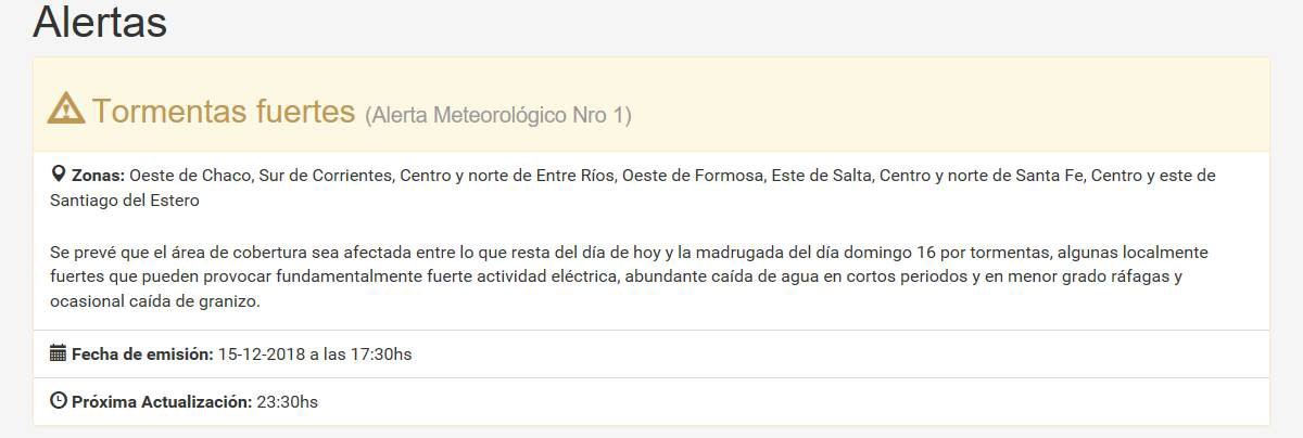 «Se prevé que el área de cobertura sea afectada entre lo que resta del día de hoy y la madrugada del día domingo 16 por tormentas, algunas localmente fuertes que pueden provocar fundamentalmente fuerte actividad eléctrica, abundante caída de agua en cortos periodos y en menor grado ráfagas y ocasional caída de granizo», informa el comunicado.