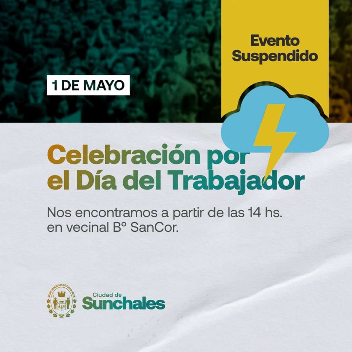 Ante los pronósticos de precipitaciones previstos para toda la jornada de este miércoles, el Municipio informó que se ha resuelto suspender las actividades previstas para celebrar el Día del Trabajador en Barrio SanCor.