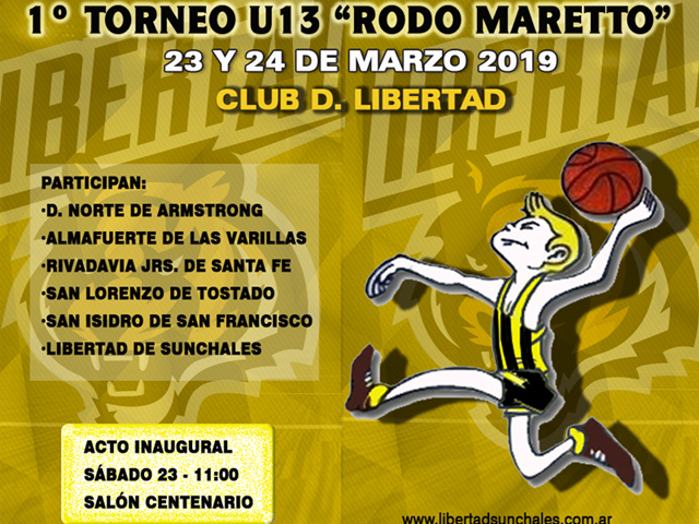 Con la organización del Deportivo Libertad se realizará entre el sábado y domingo el Primer Torneo U13 «Rodo Maretto». El mismo contará con la participación de seis clubes: Deportivo Norte de Armstrong, Almafuerte de Las Varillas, Rivadavia Jrs. de Santa Fe, San Lorenzo de Tostado, San Isidro de San Francisco y el anfitrión.