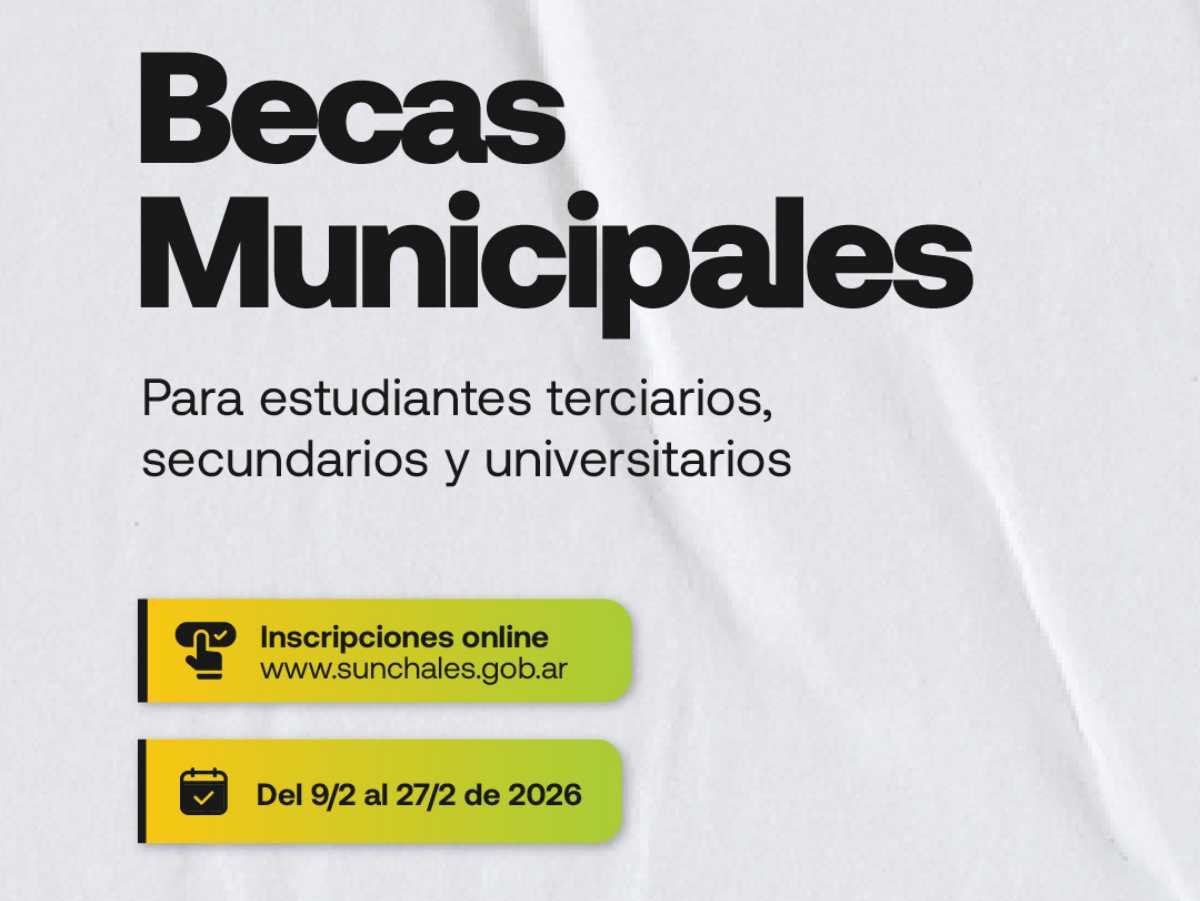 La Municipalidad de Sunchales, a través de la Subsecretaría de Promoción de Derechos, informa que a partir del próximo lunes 9 de febrero se encontrará abierta la convocatoria a Becas Municipales 2026, destinadas a estudiantes de nivel secundario, terciario y universitario, en el marco de lo establecido por la Ordenanza Nº 2993/2022.